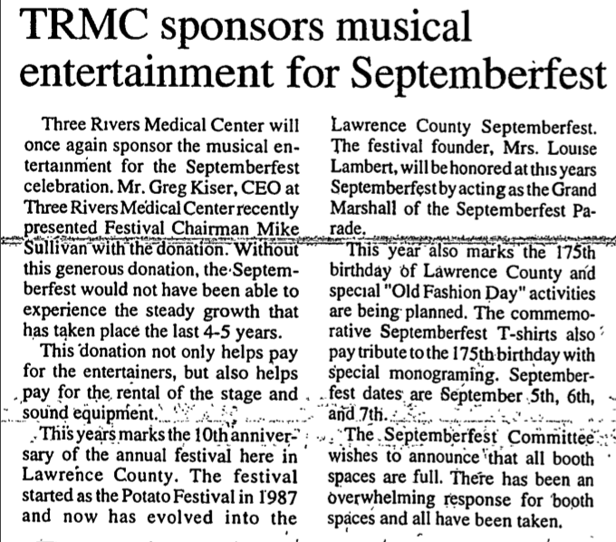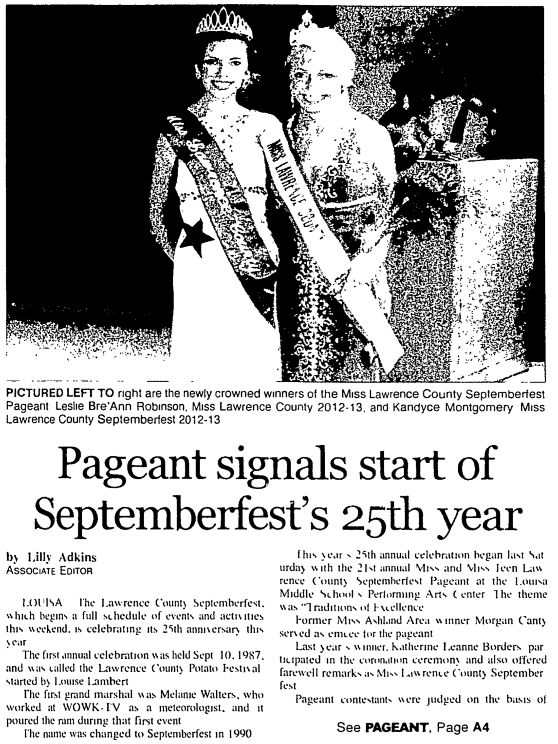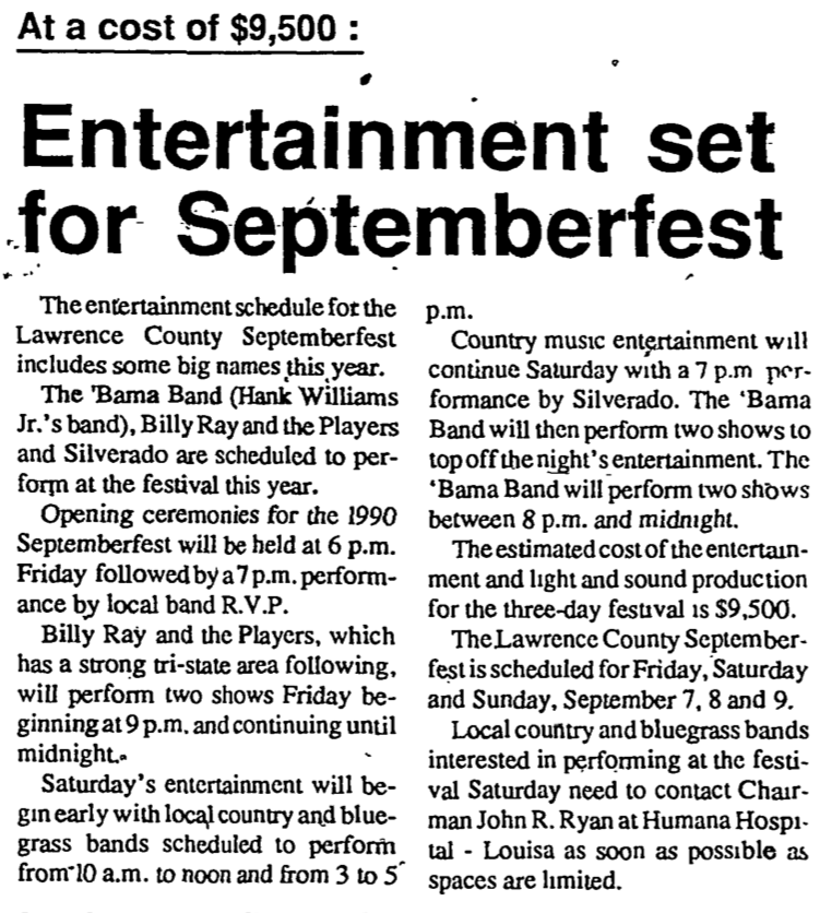 Sandra Osborne, the managing editor for The Big Sandy News at the time stated “the name wasn’t really representative of Lawrence County at all… granted the Lawrence County Septemberfest is a generic name, not specifically representative of the county… [the name] is general enough to be used in 1990 or 2000, regardless of the changes Lawrence County might experience.”